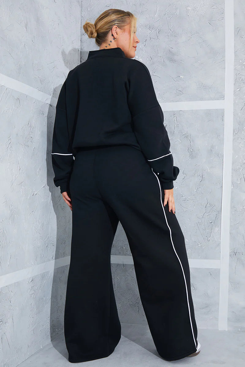 Stock up on your comfies with our new black contrast piping wide leg joggers. Pair with a cropped t-shirt and trainers for a cute and casual vibe.