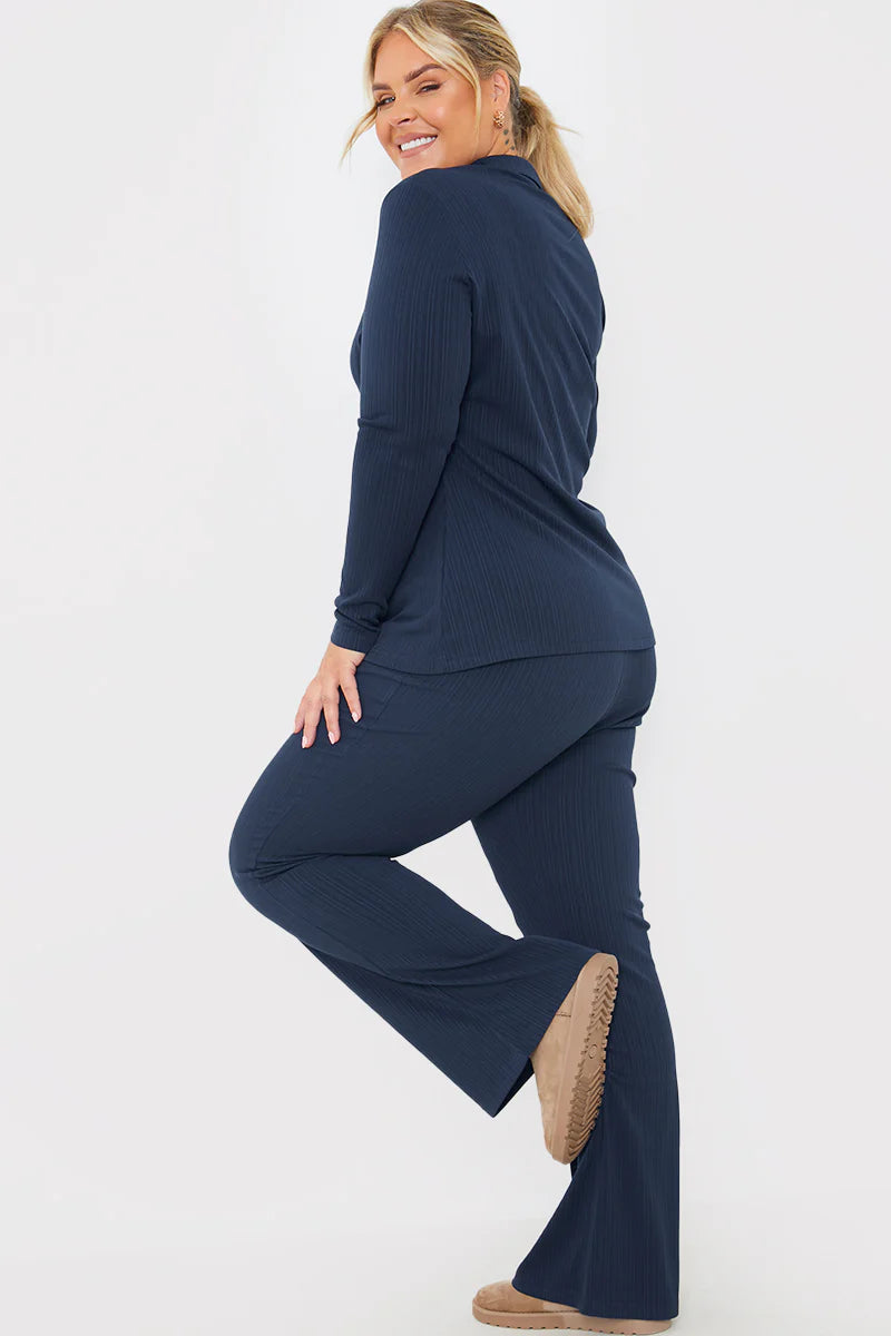This blue ribbed flared trousers are perfect for lounging. Pair it effortlessly with our matching blue ribbed shirt for a look that's chic and comfortable.