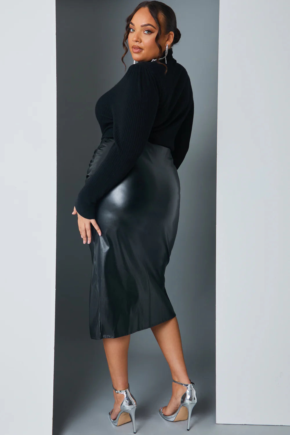 We are loving this black ruched split detail midi skirt perfect for these colder months! In a PU fabric. team with tights and boots to complete the look.