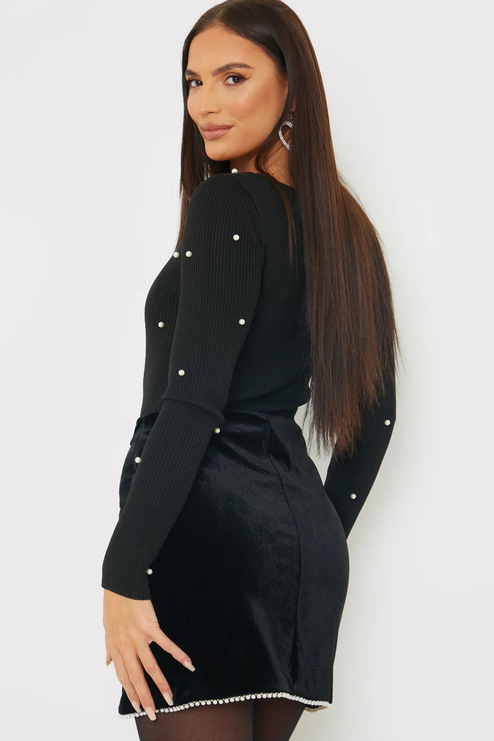Add texture to your wardrobe this season with our new black velvet faux pearl trim mini skirt. Wear with boots for a chic look.