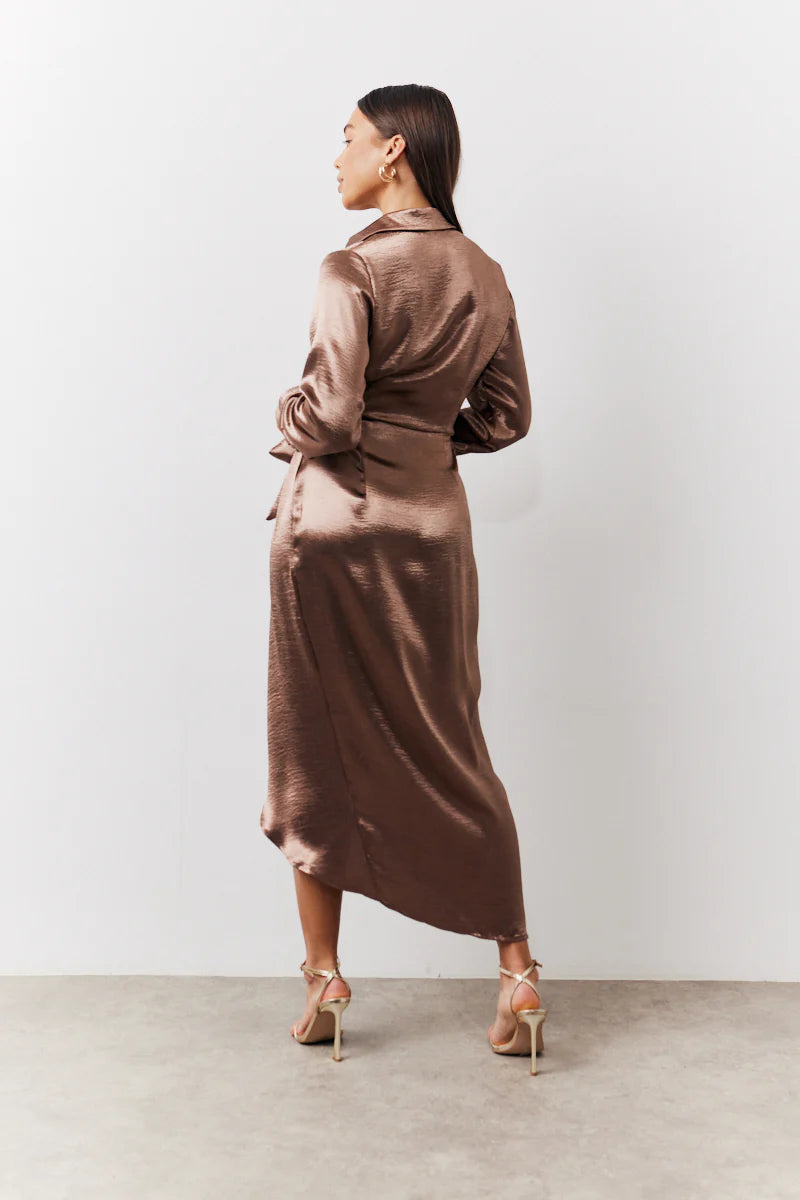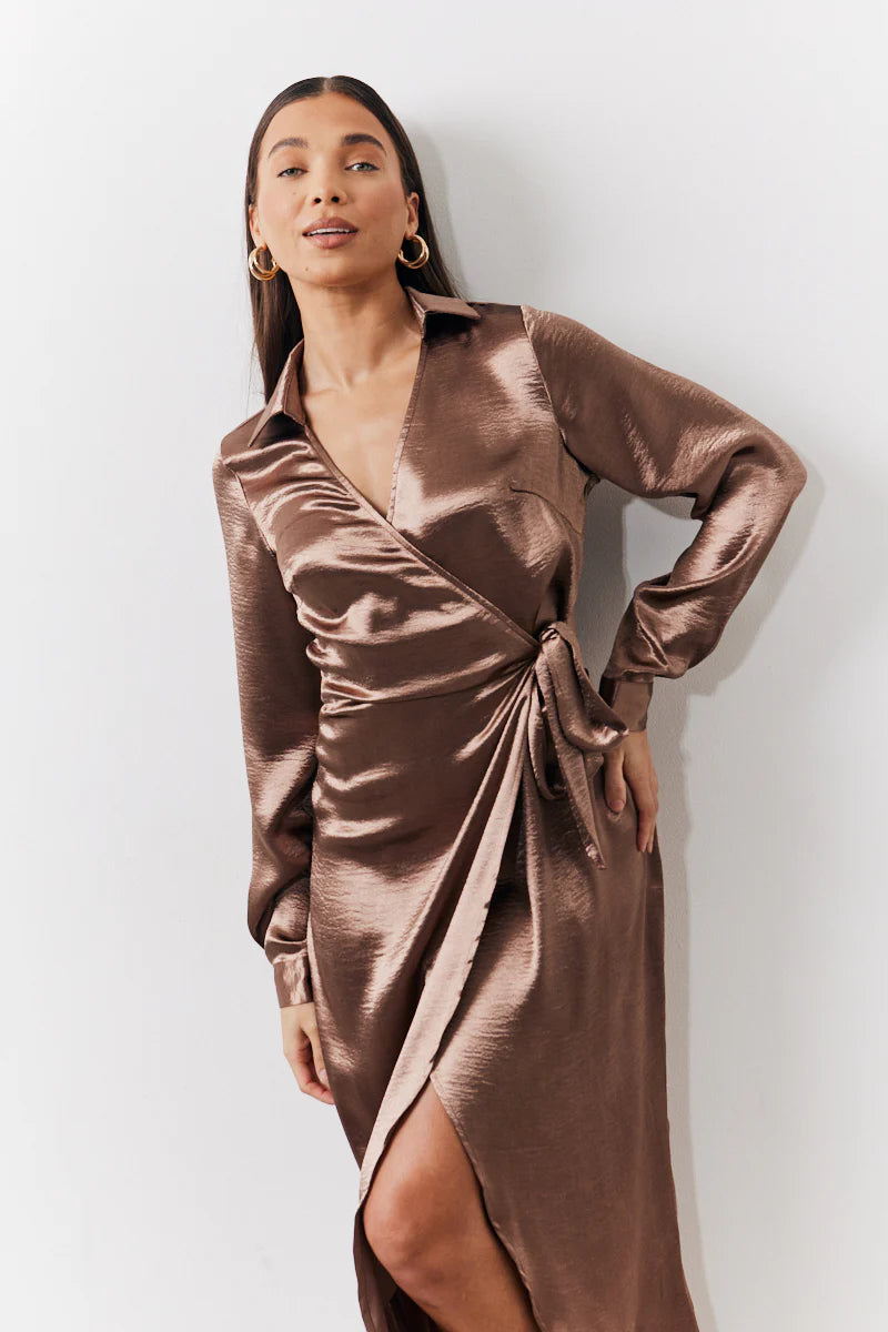 Look spotlight-ready with our new bronze satin wrap midaxi dress. Pair with gold heels for a look that will turn heads.