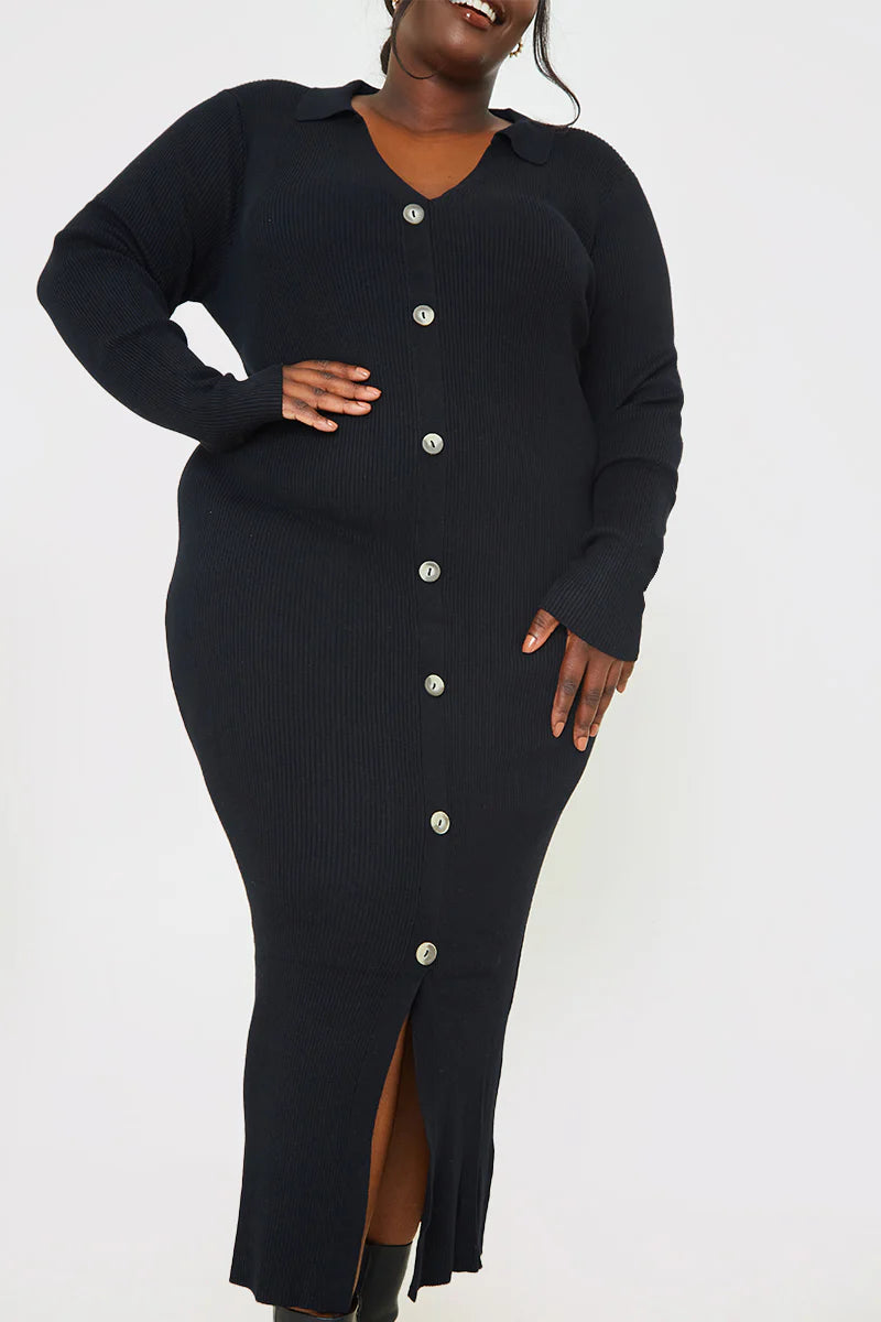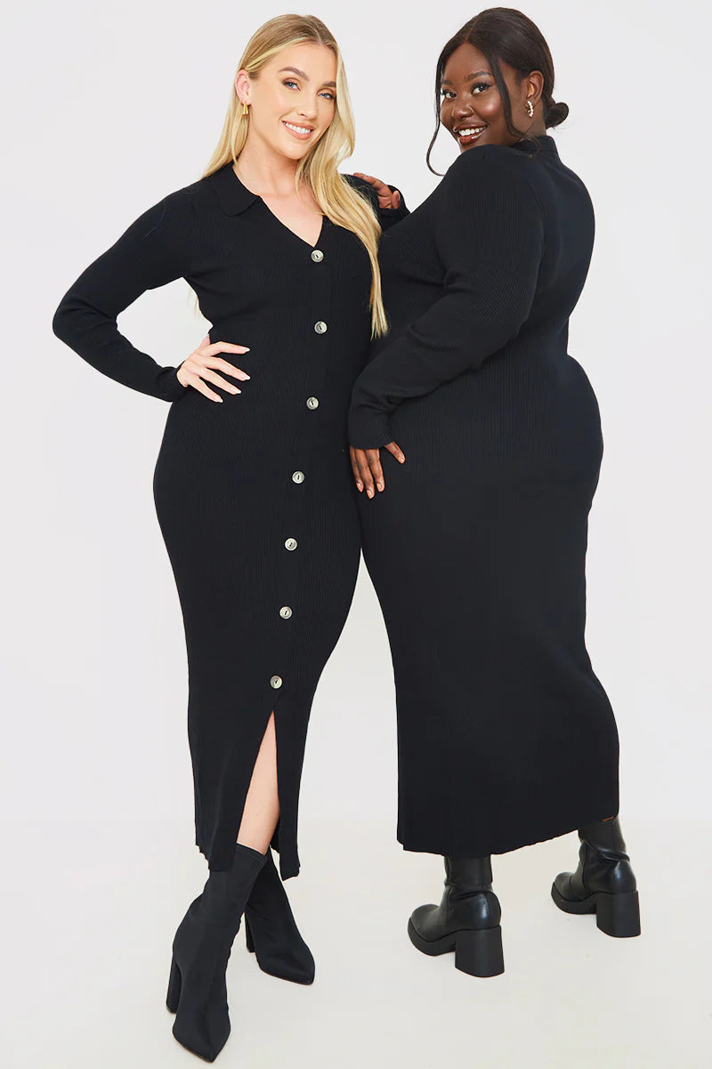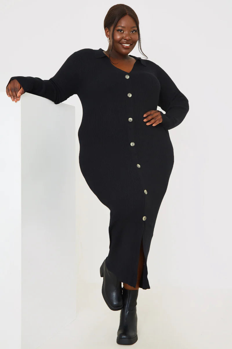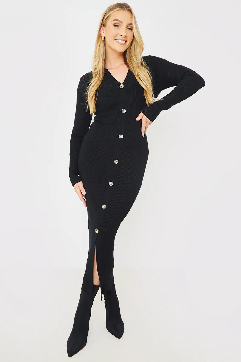 We're obsessing over this midaxi dress. Featuring a black ribbed material and non functional buttons detailing. style with boots and accessories for the perfect chilled vibe.