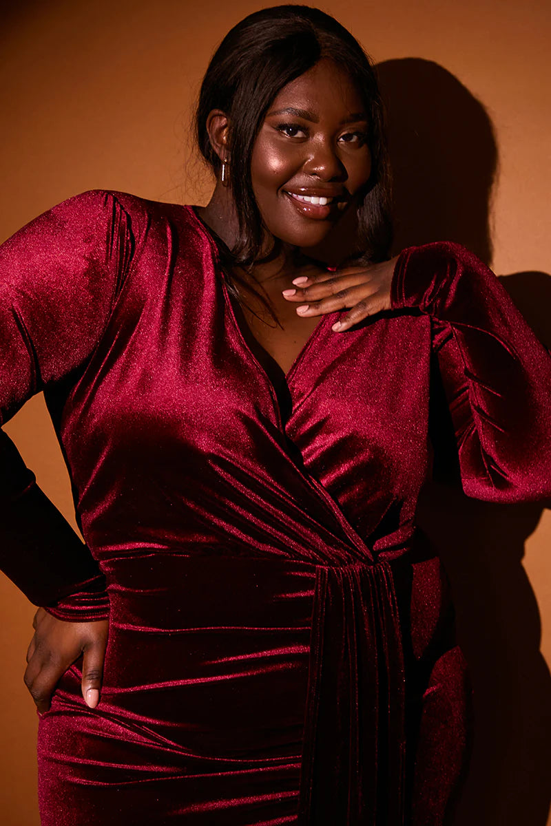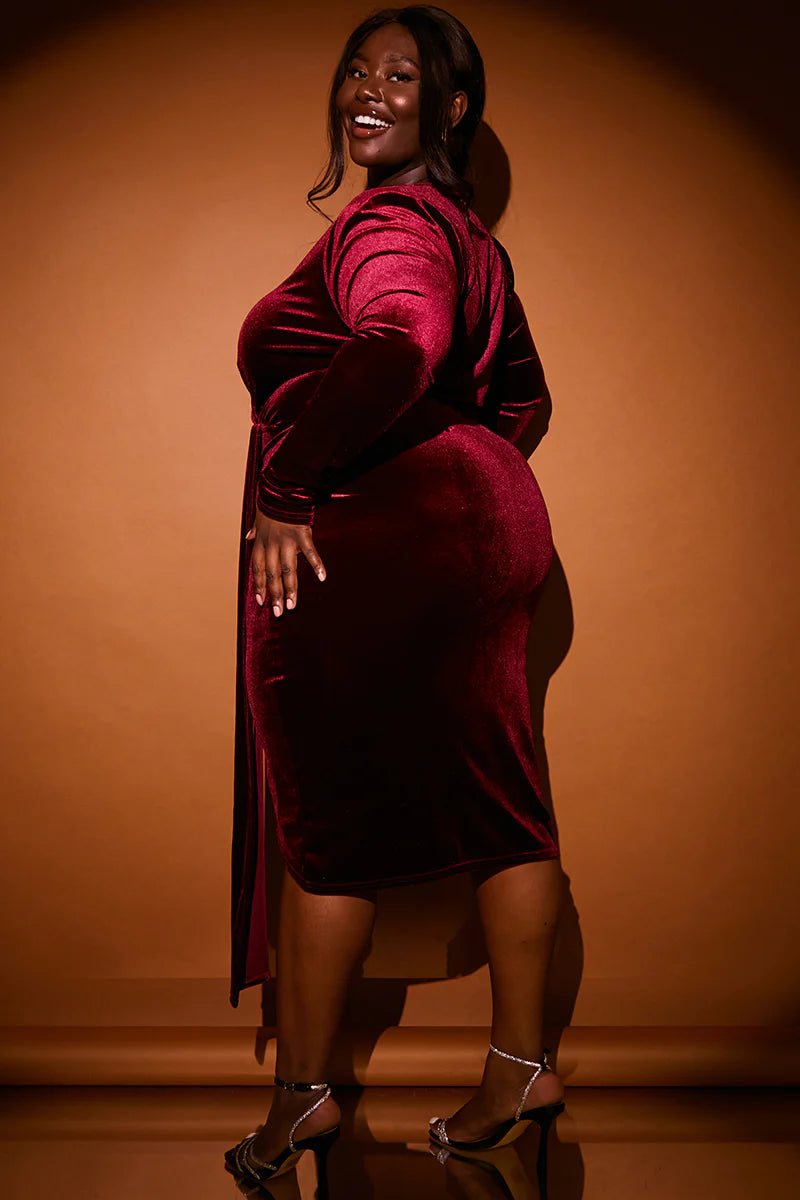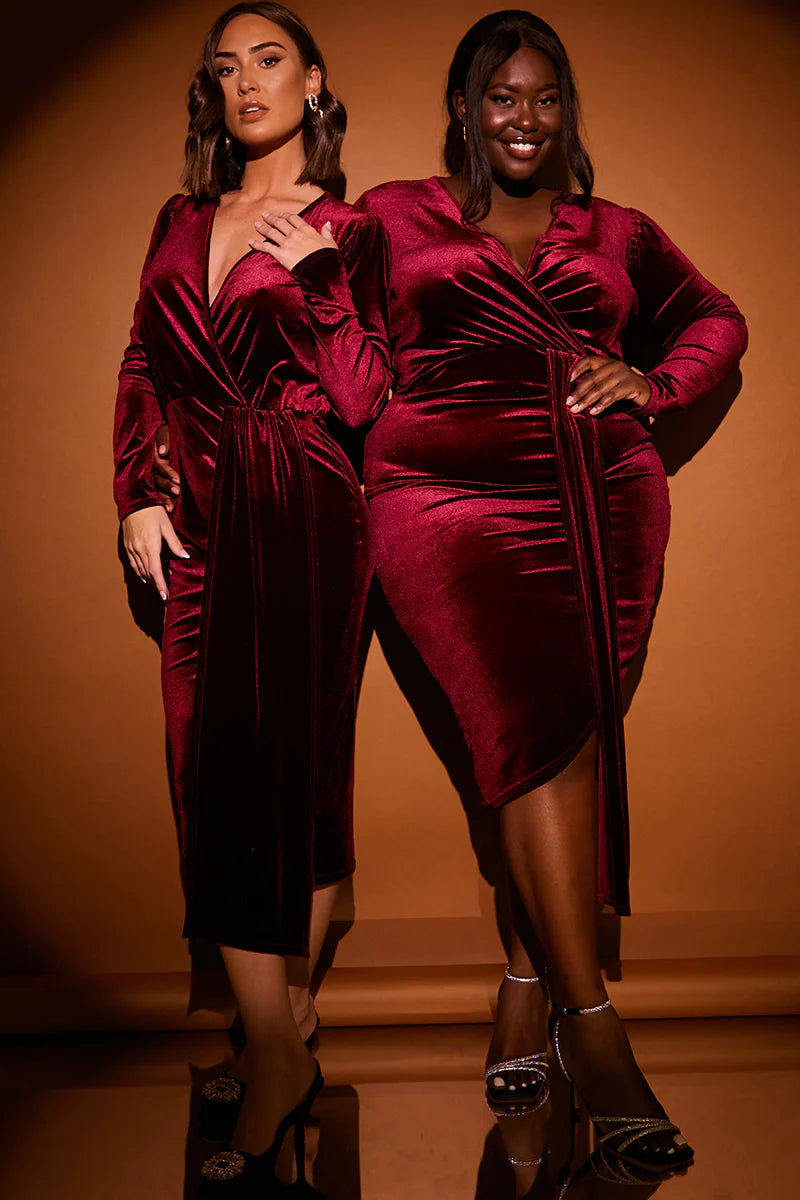 This red midi dress is perfect for the party season! Featuring a red velvet material with a wrap front and drape detailing. pair with heels for a stylish look.