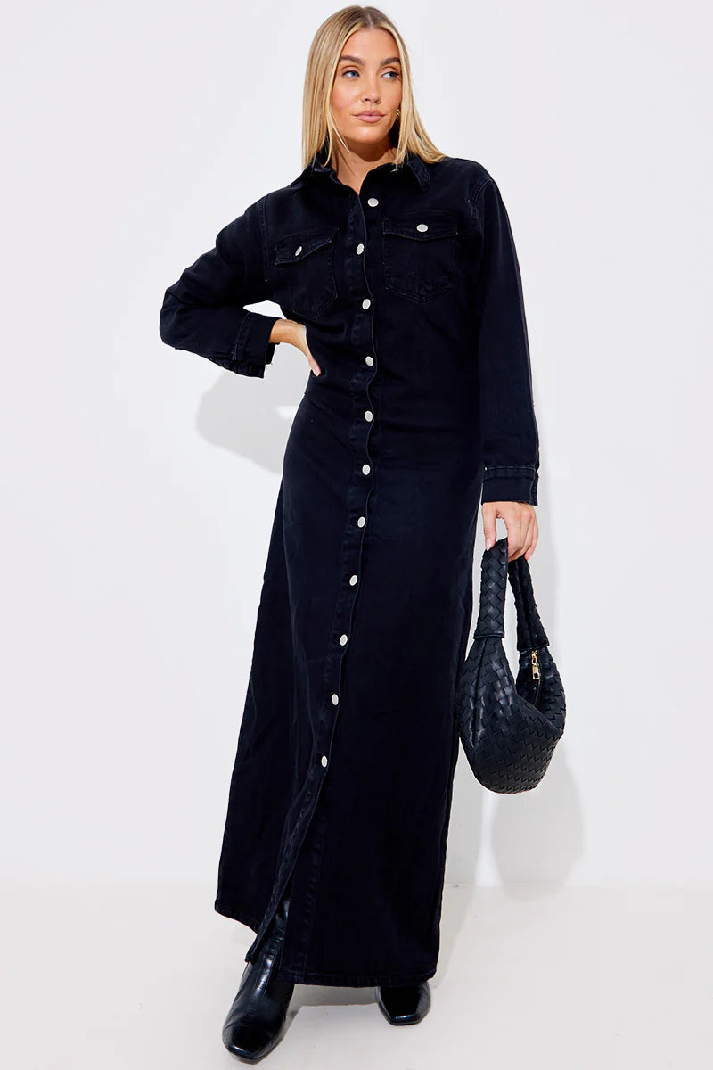 This Black Long Sleeve Denim Maxi Dress is a wardrobe must-have! The classic black and button-up style make it versatile and perfect for any occasion. Pair it with some chunky boots for a look we love.