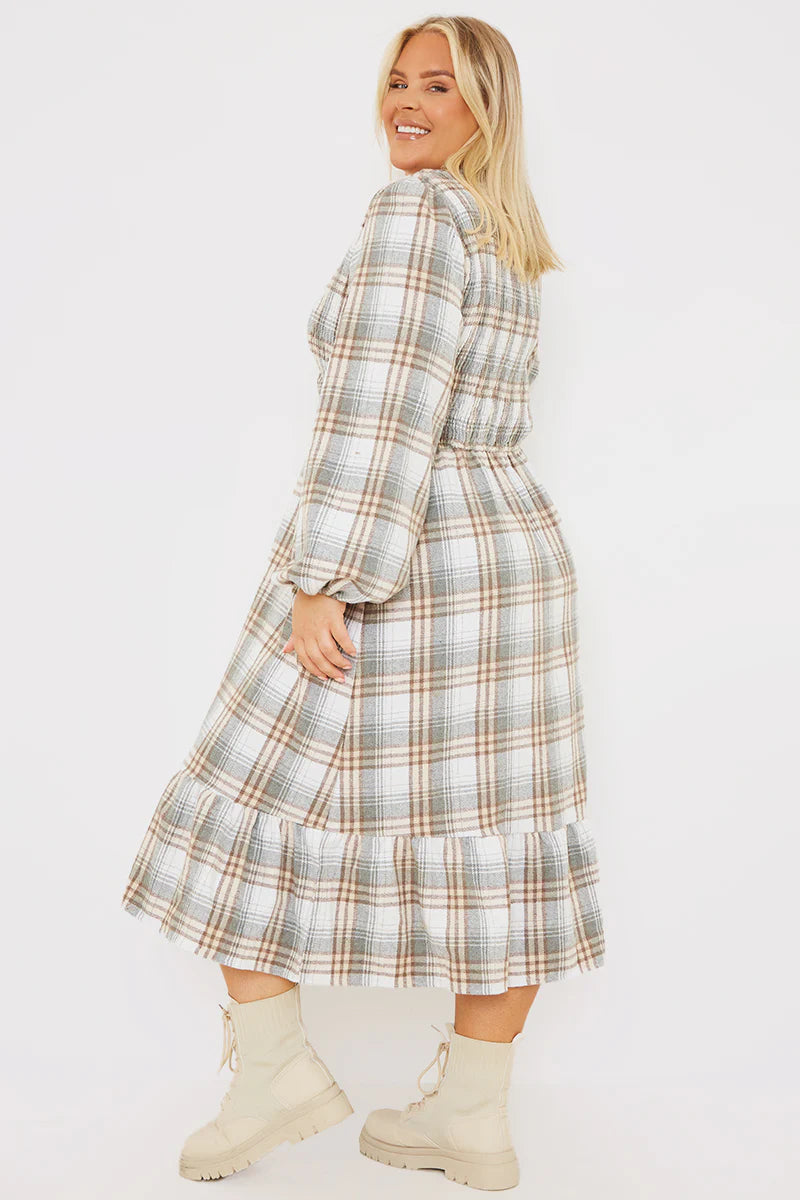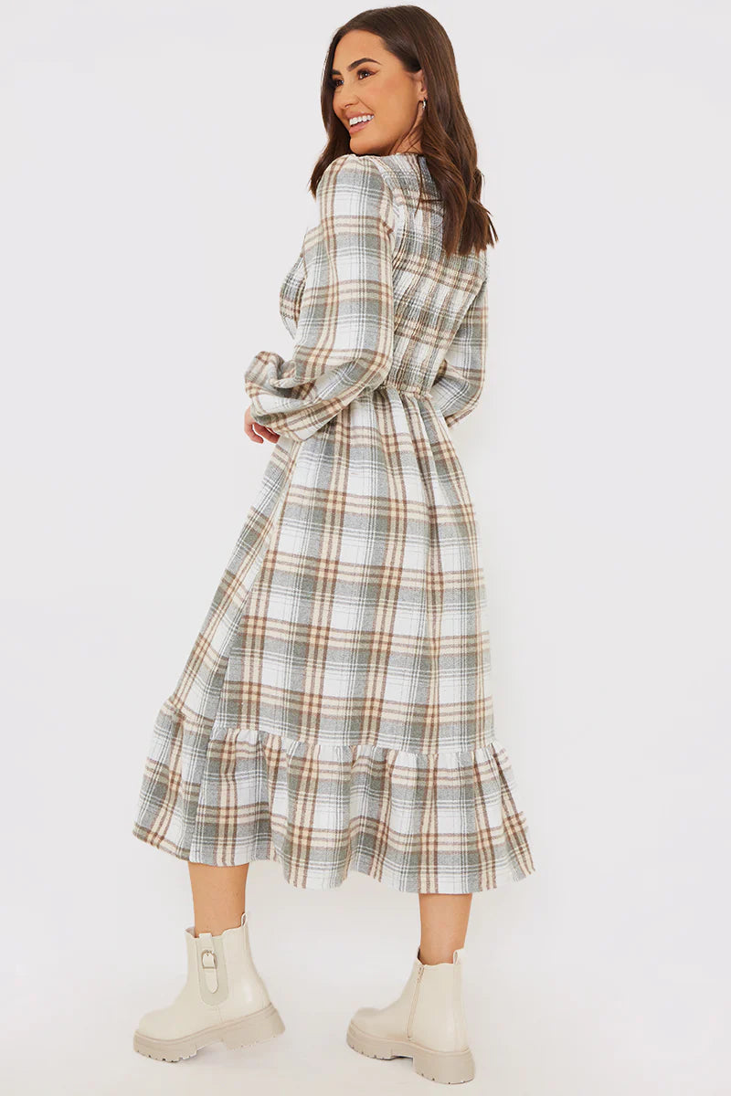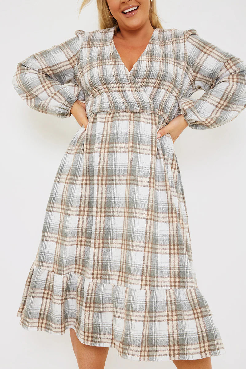 We are obsessed with this dress. In a grey check material with a wrap front. team with simple accessories for a stylish look.
