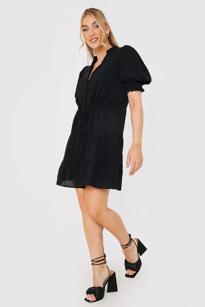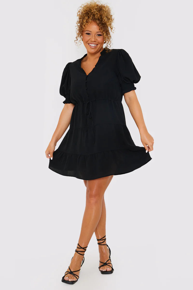We are loving this gorgeous black mini dress! Featuring a balloon sleeves and a drawstring waist. style with heels to finish the look.