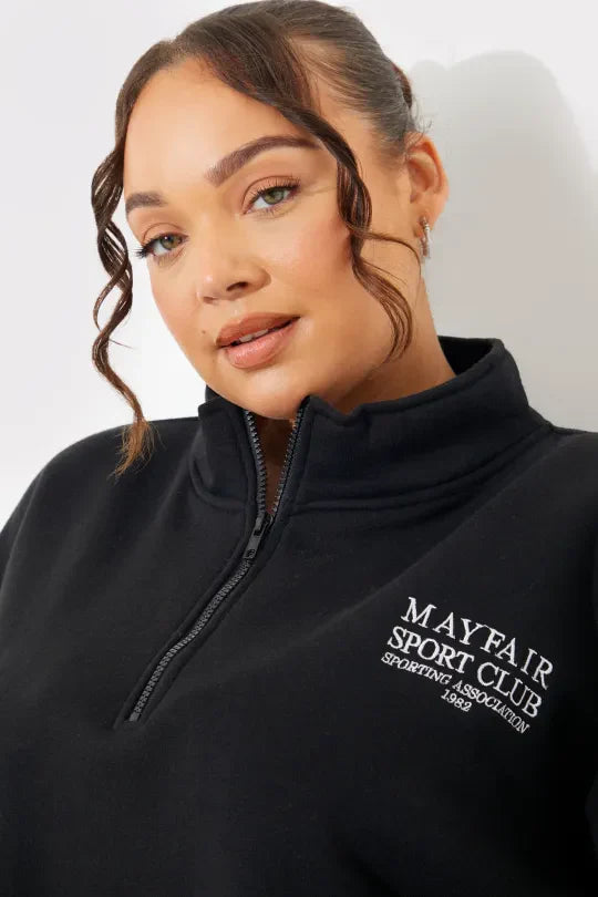 Look cool. dress comfy in our new black half zip up embroidered jersey sweater. Pair with the joggers or leggings for a vibey look.