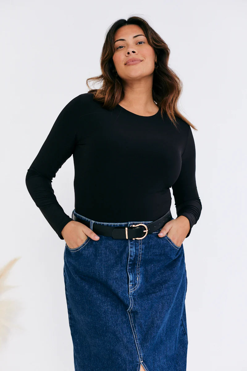 This long sleeved double-layered slinky bodysuit is the staple piece you need in your wardrobe. Pair with any of your favourite bottoms for the easiest outfit.