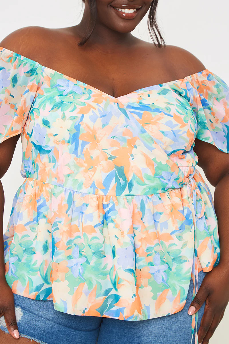 This new floral print blouse is the ultimate summer top you need in your wardrobe. With a flattering off the shoulder detail and a wrap front. style this top with your favourite blue jeans and flats for an elevated casual outfit you'll love.
