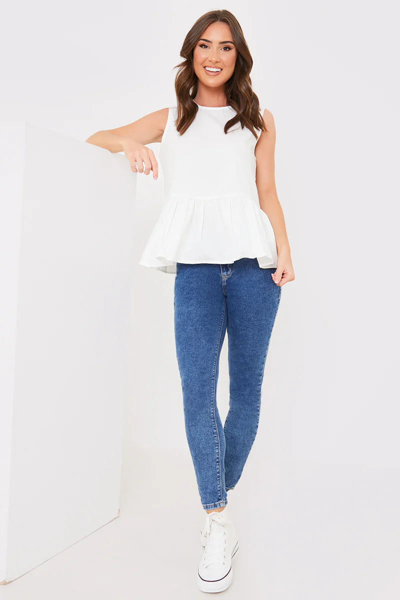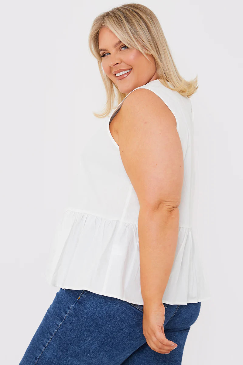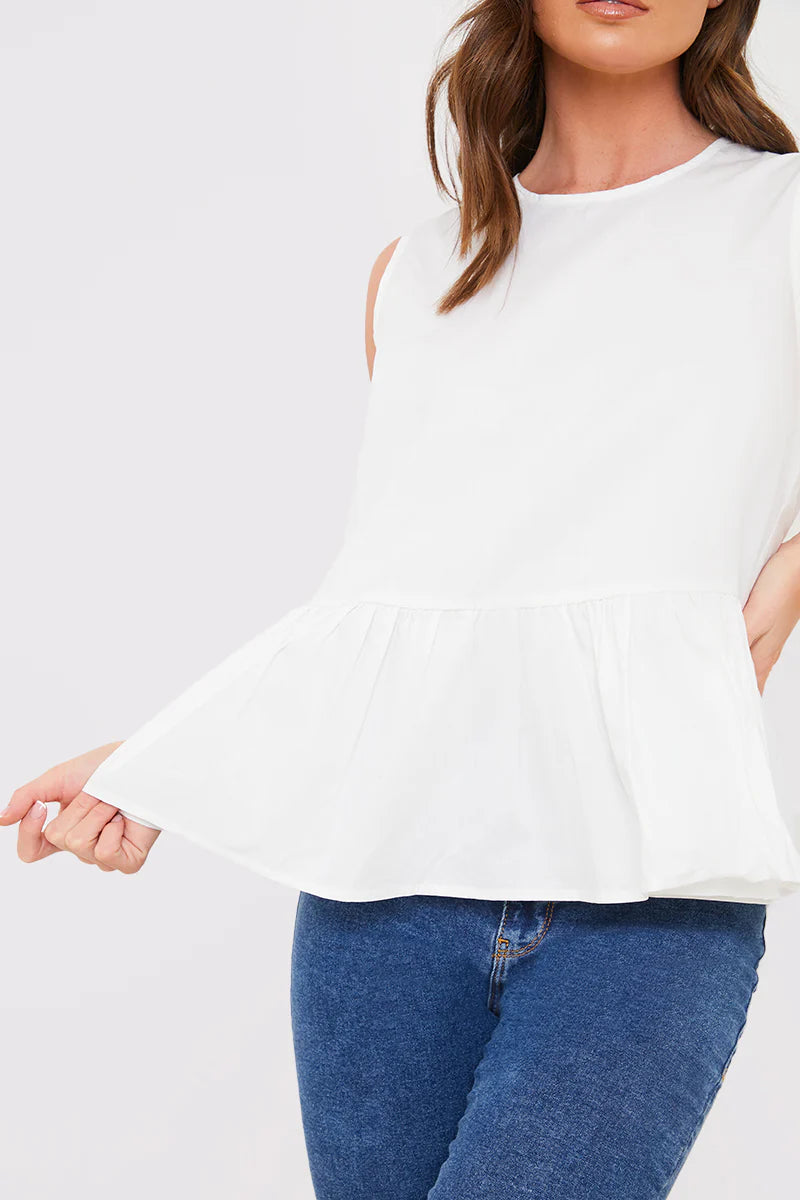 This gorgeous pink sleeveless blouse is a wardrobe must have with frill peplum detail. pair with trousers for a look we are loving this season.