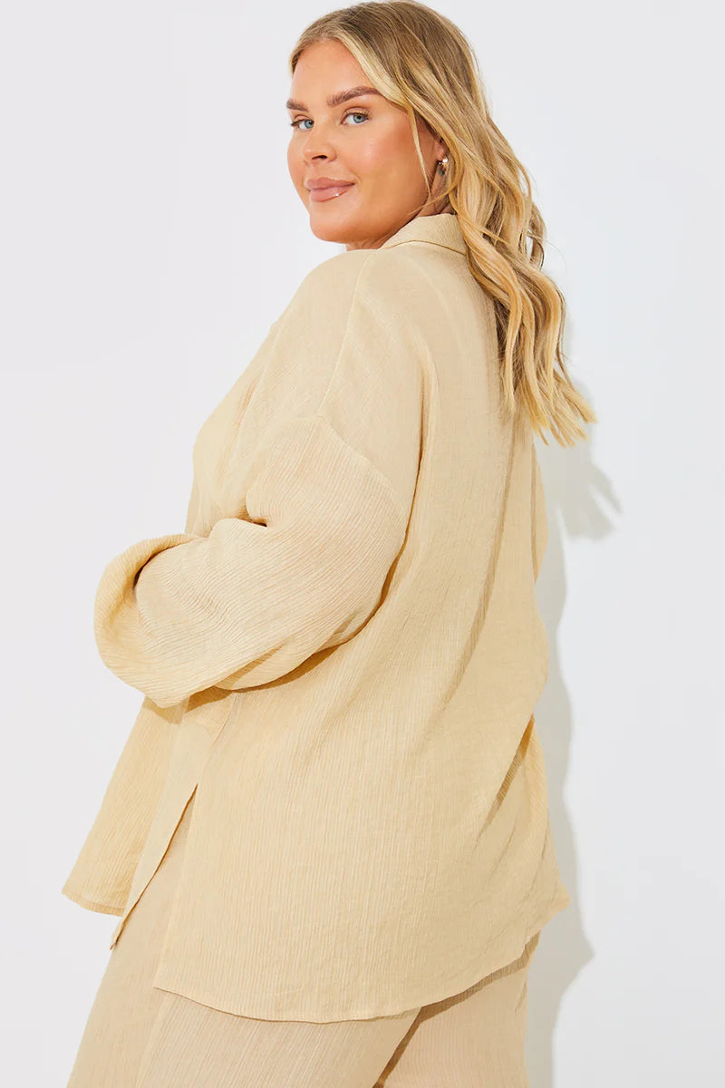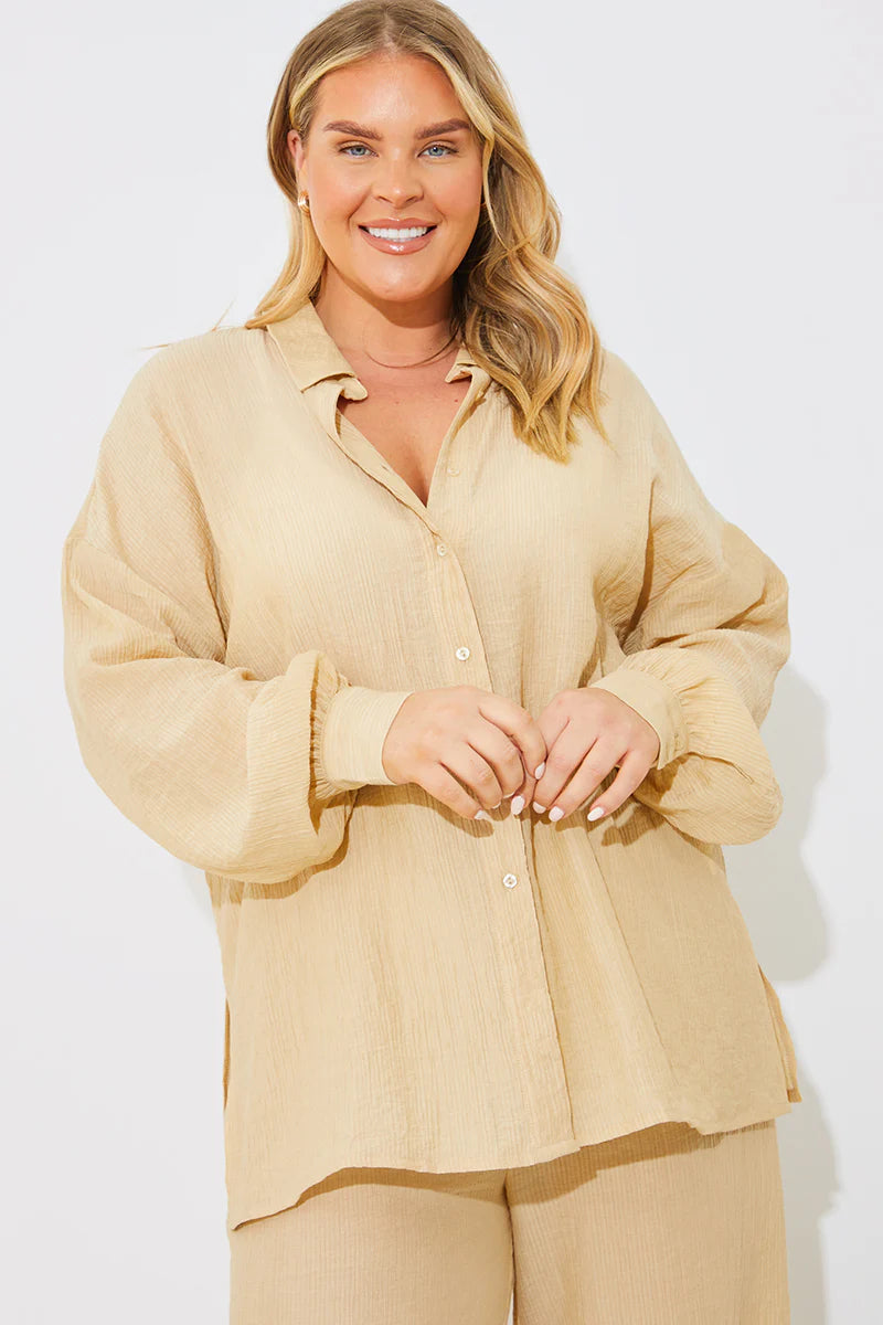 This camel crinkle oversized shirt is everything you need for summer. Pair with the matching trousers for the cutest look.