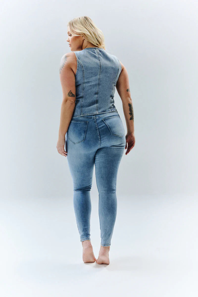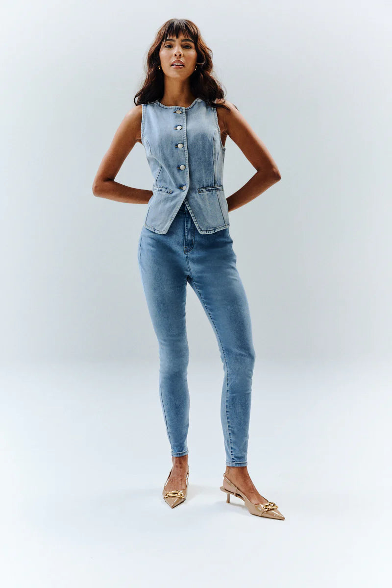 This denim crew neck waistcoat makes any outfit effortlessly chic. Pair with your favourite jeans to complete your on-trend look.