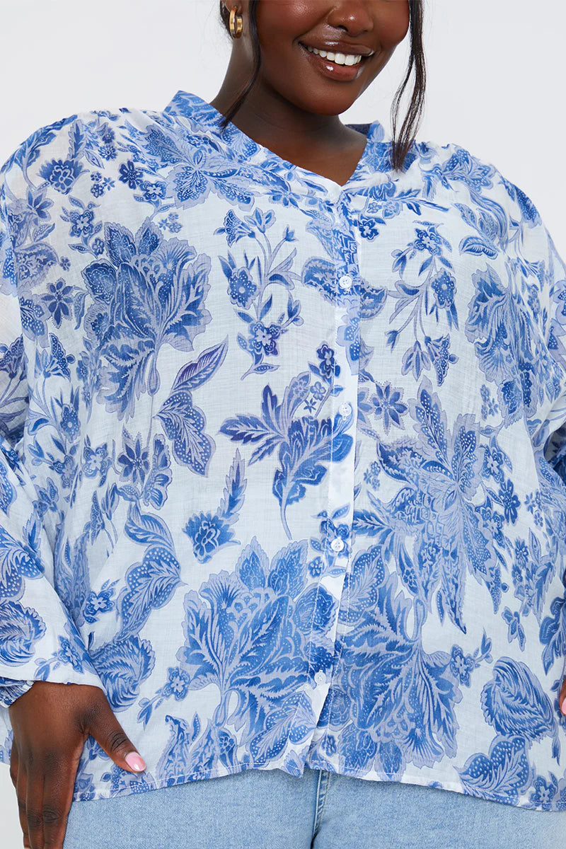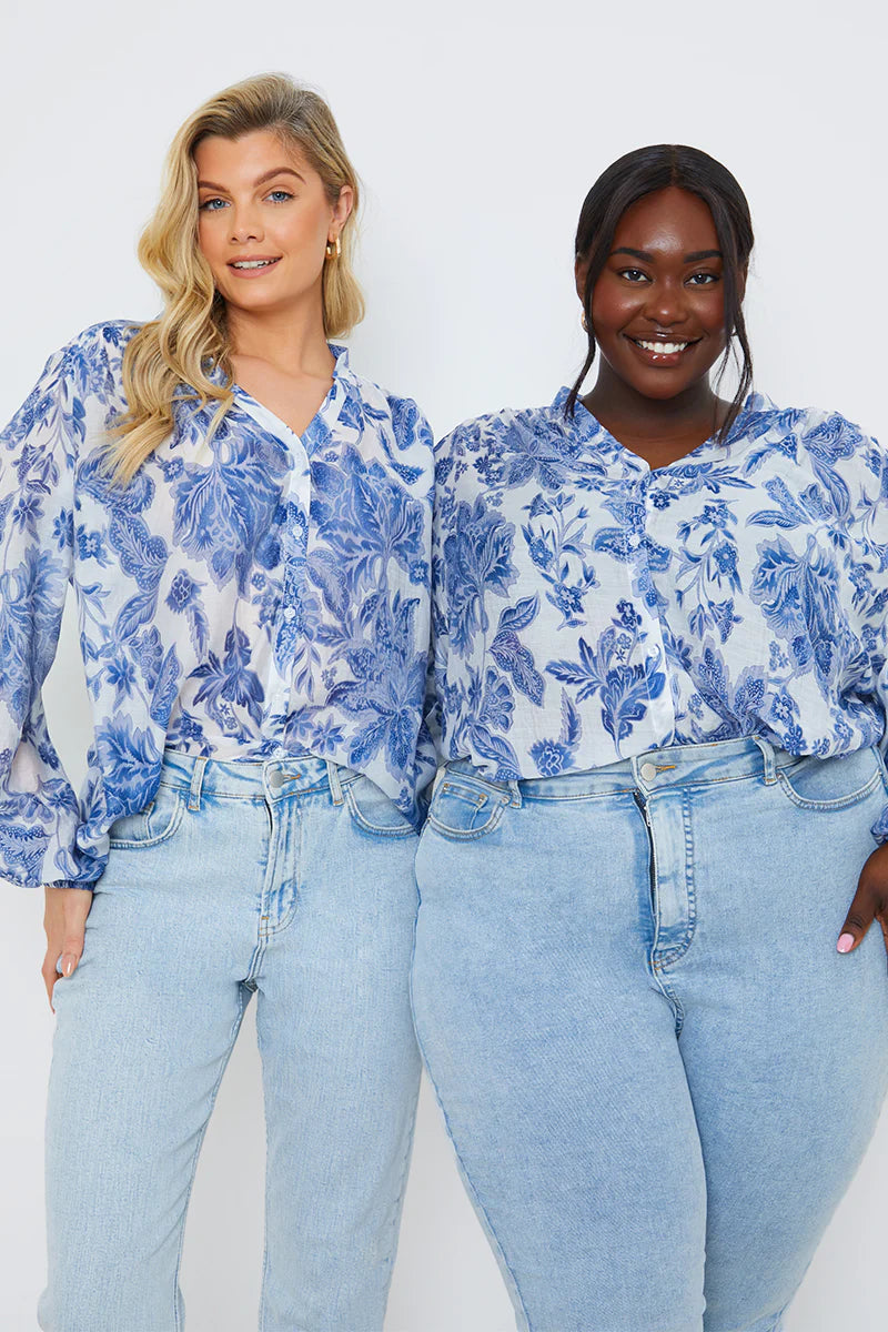Add some colour to your wardrobe with our new blue floral shift blouse. Wear with trousers or jeans for the perfect summer look.