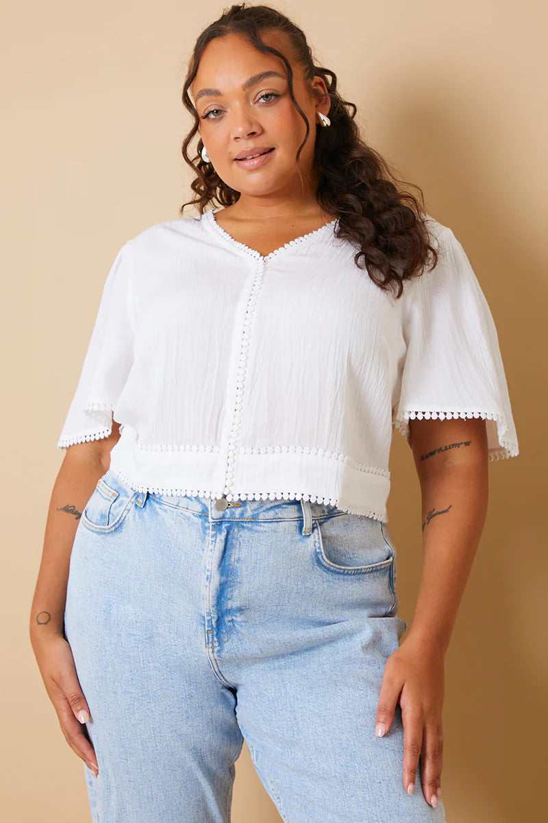 Update your basics with our new white linen look trim detail top. Pair with jeans. skirt or shorts to create a variety of looks.