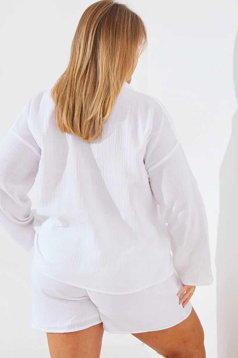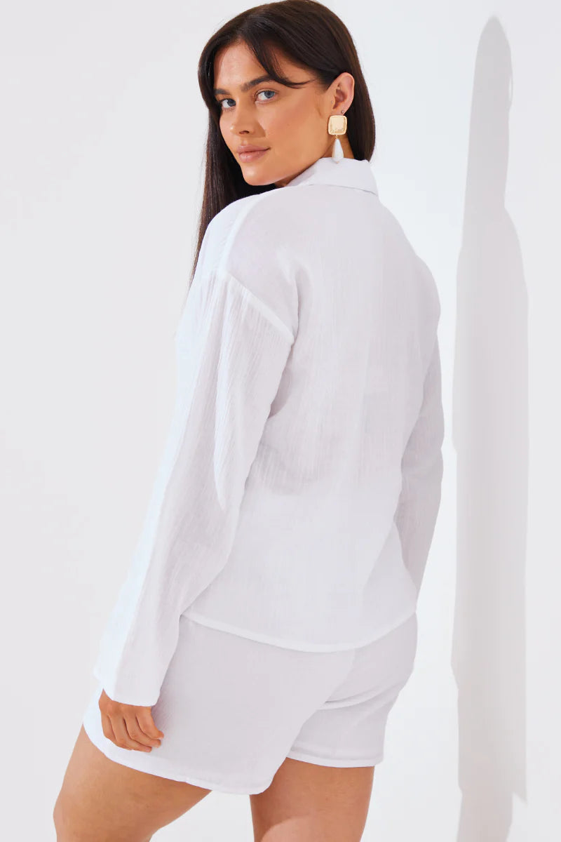 This white cotton shirt is a summer must have. Pair with the matching shorts and a pair comfortable flats for a daytime outfit we're obsessed with.