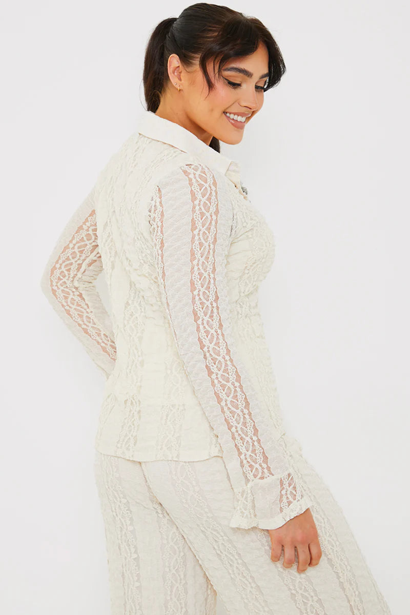We are loving this co-ord shirt. In a cream textured lace material. pair the matching trousers for a look thats perfect this summer.