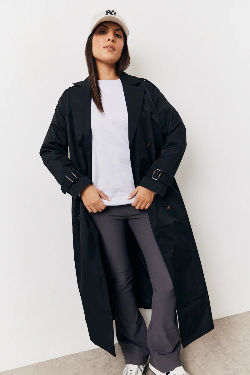 Our new black longline trench coat is the ultimate wardrobe essential you need this season. It's chic. comfortable and versatile. we guarantee you'll be wearing this time and time again. Style over anything from jeans and a t-shirt to a cute fine knitted dress.
