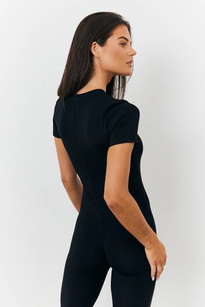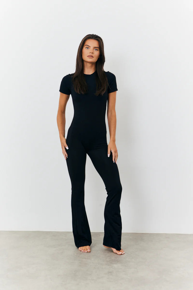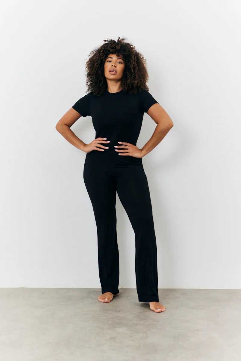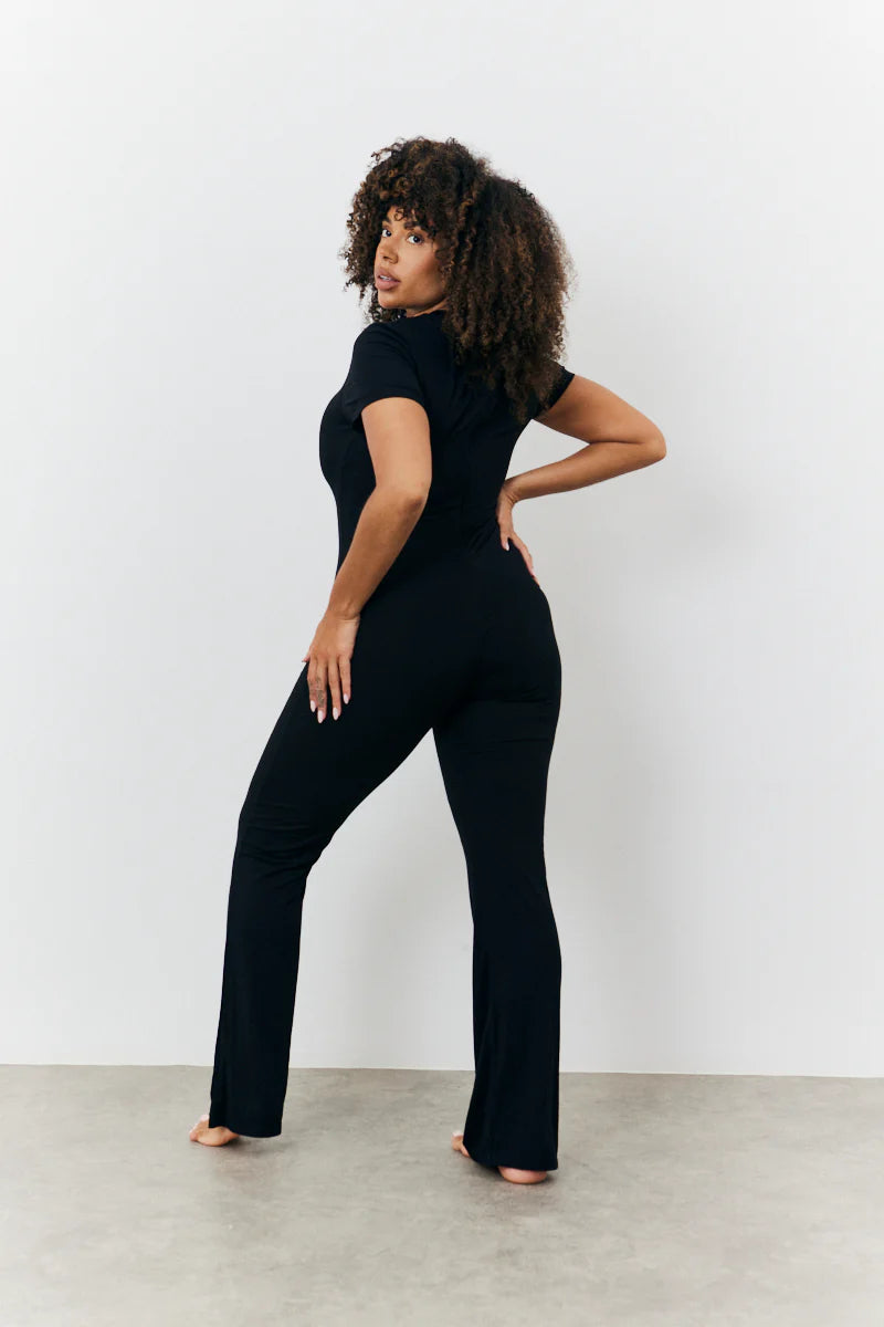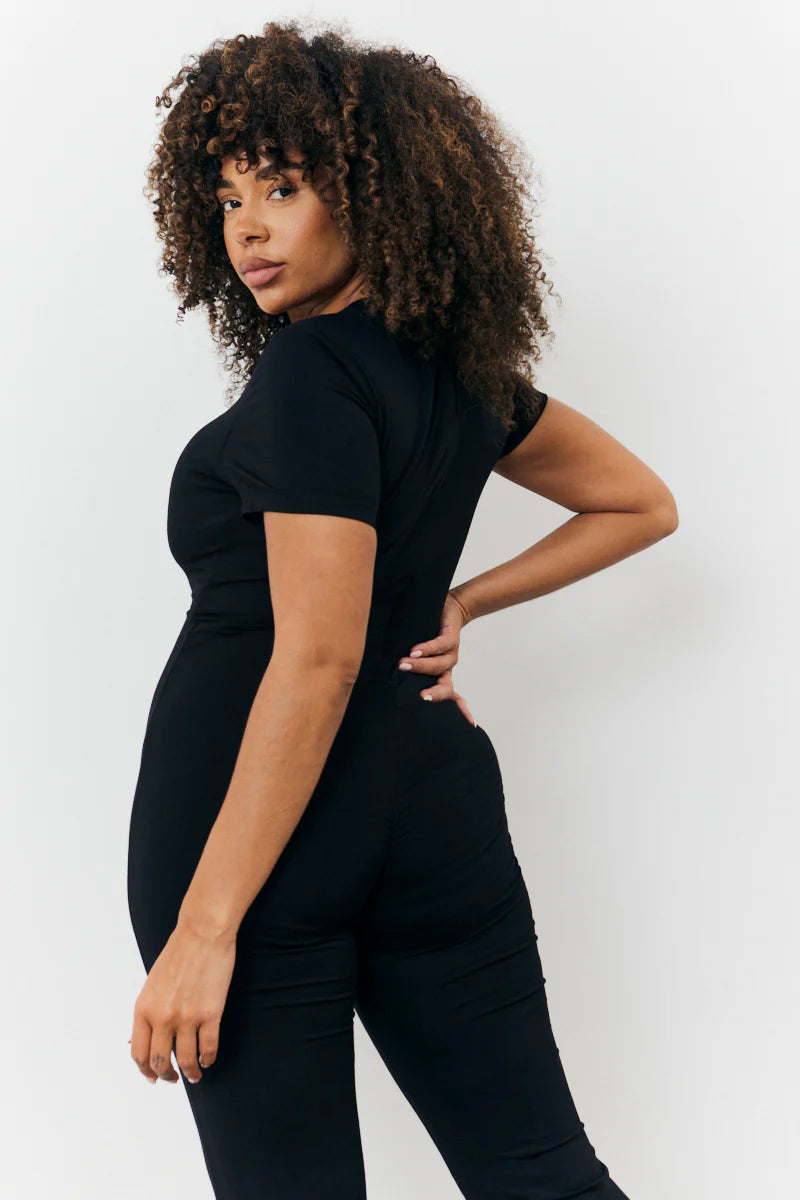 Our new black sculpting wide leg jumpsuit from the fits collection is the wardrobe staple you've been waiting for. Featuring a crew neck and short sleeves. this all-in-one is perfect for anything from chilling at home to heading out and about. Style with trainers and a denim jacket for running errands. or elevate with heels and a leather jacket. However you're styling this jumpsuit. you'll look and feel your best.