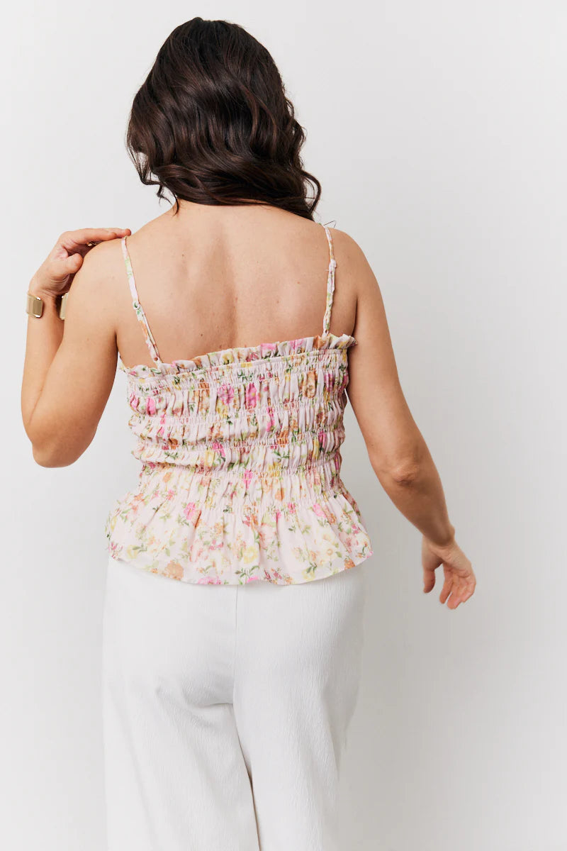 Update your look with this new pink floral print shirred cami top from our latest collection. Wear with jeans or shorts to complete the look.