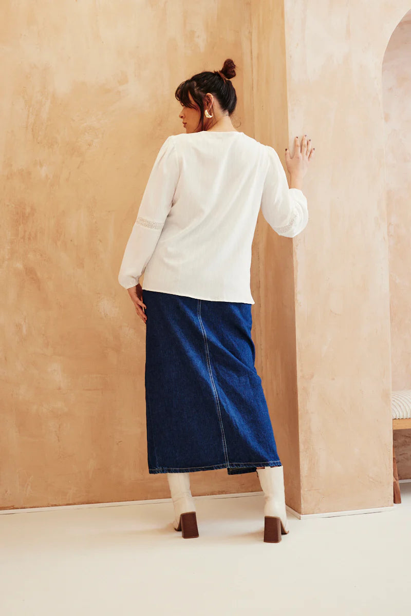Stay on trend with our new white v neck blouse from our new boho drop. featuring crochet insert. this will elevate your look. Pair with jeans or a skirt for chic vibes.