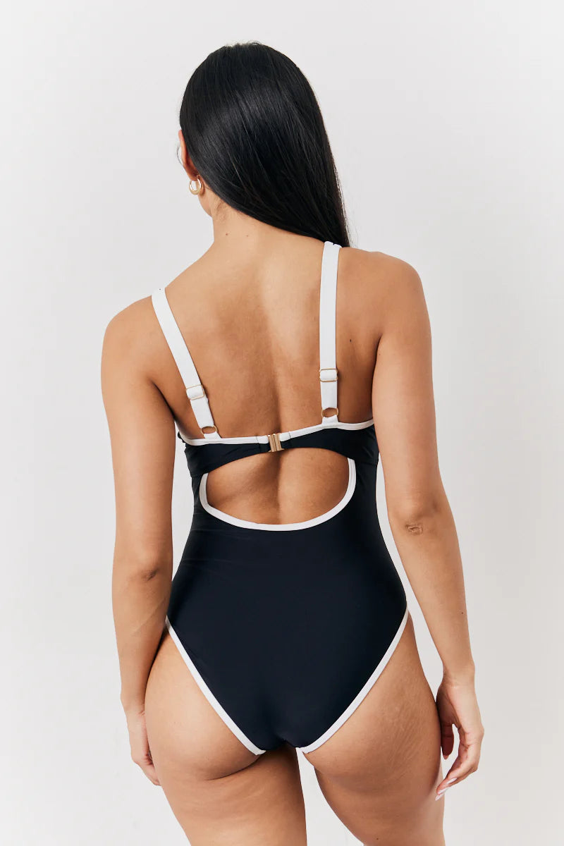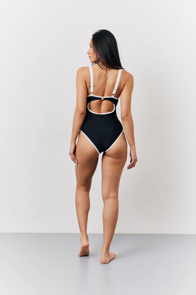 Take your poolside look to the next level with this gorgeous black U bar swimsuit. Featuring a sleek. minimalist design with a striking U-bar detail at the neckline. this swimsuit adds a touch of glam to your poolside look.
