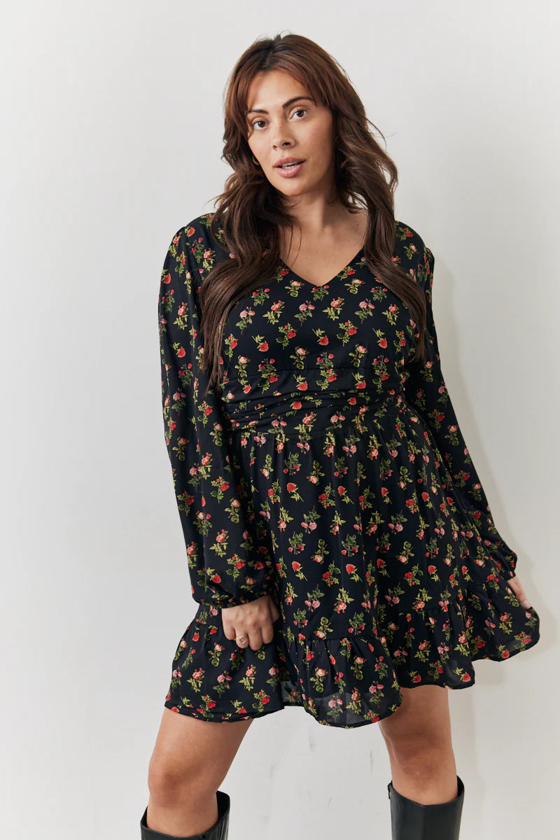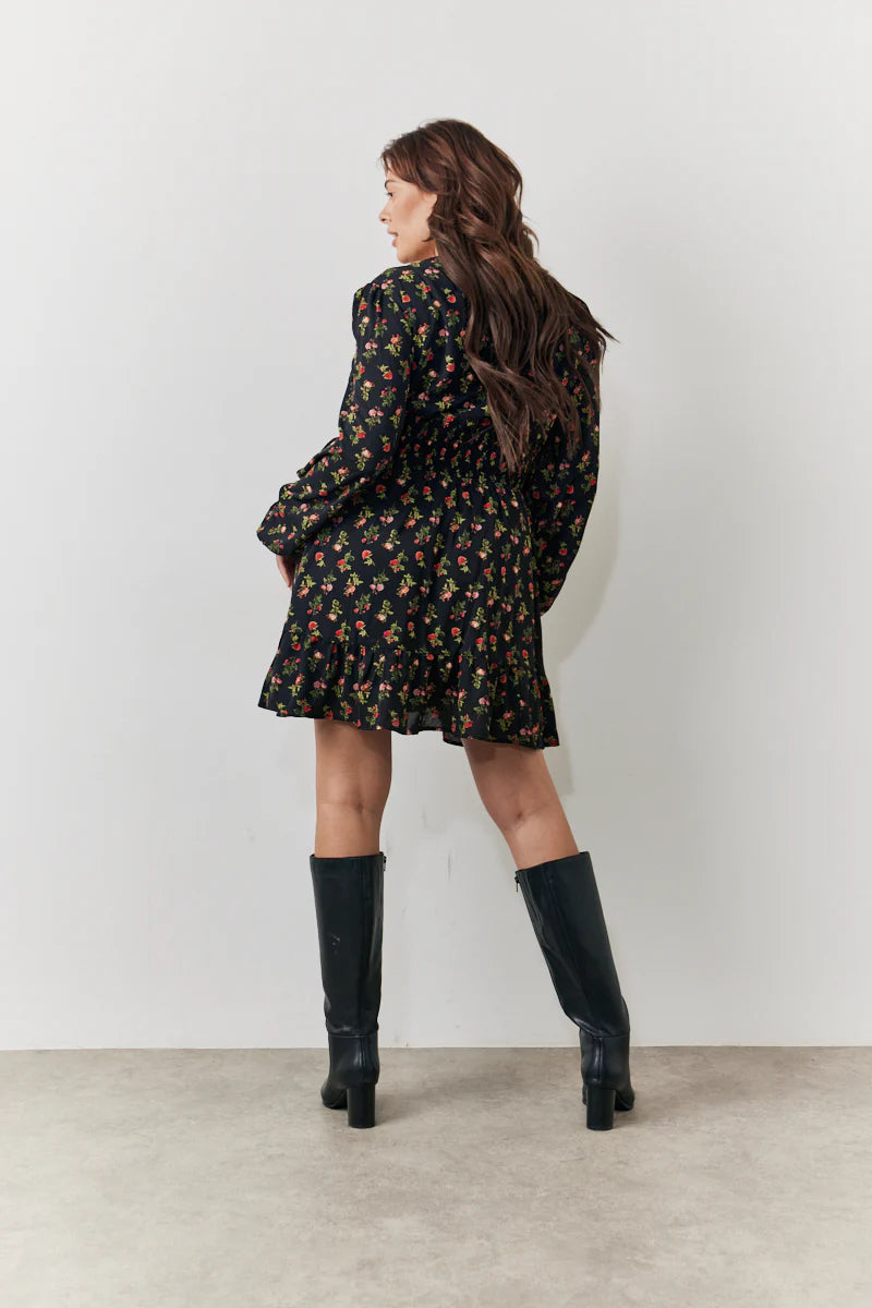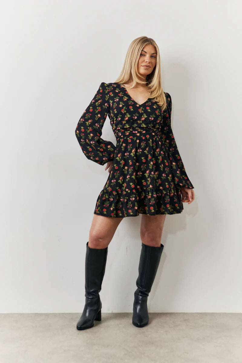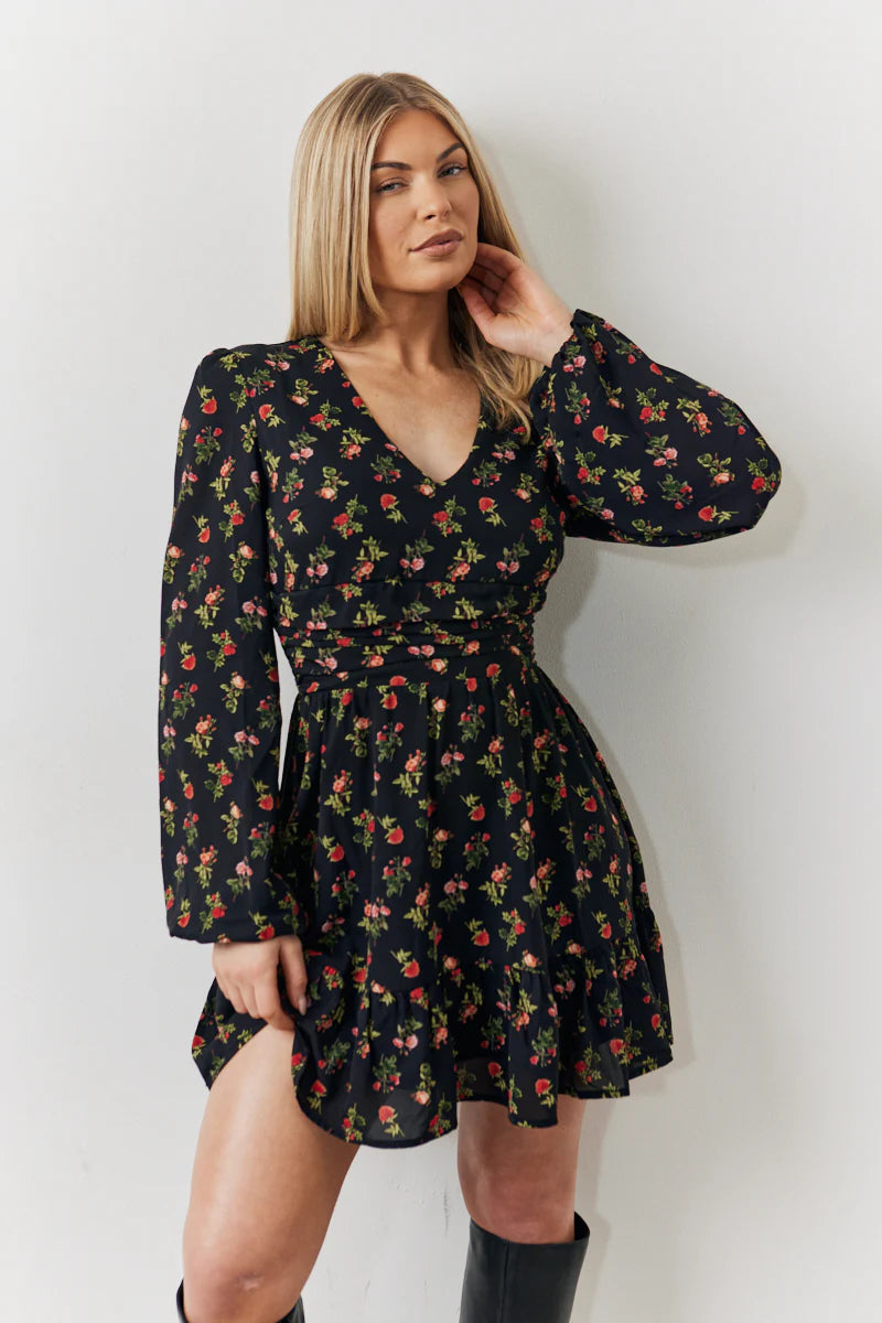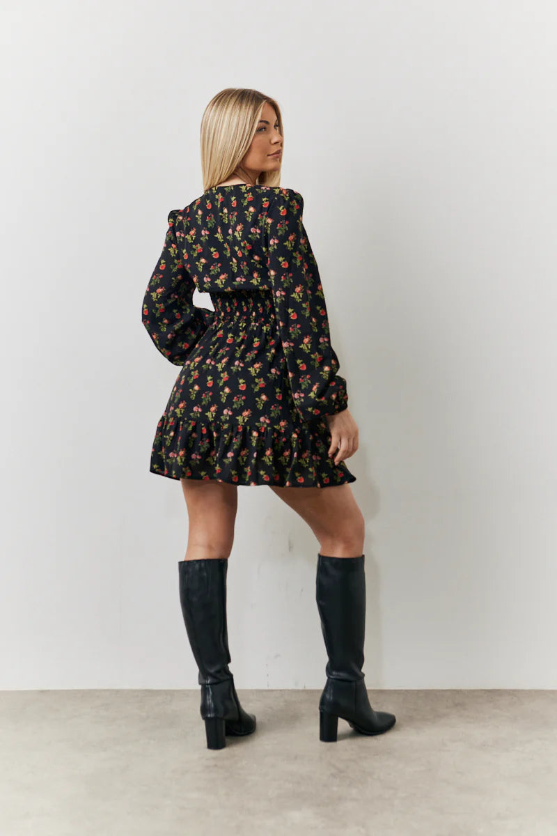 Black Rose Print Wrap Front Mini Skater Dress