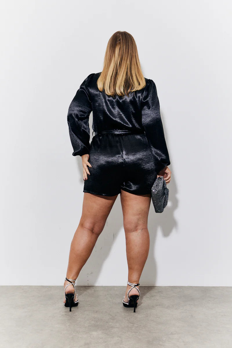 The Liquid Satin Belted Detail Playsuit is your new go-to party look. This black playsuit is designed with a soft. satin finish and features a tie belt to accentuate the waist. Ideal for an easy. stylish outfit for Christmas events or a night out. Just add your favourite heels!