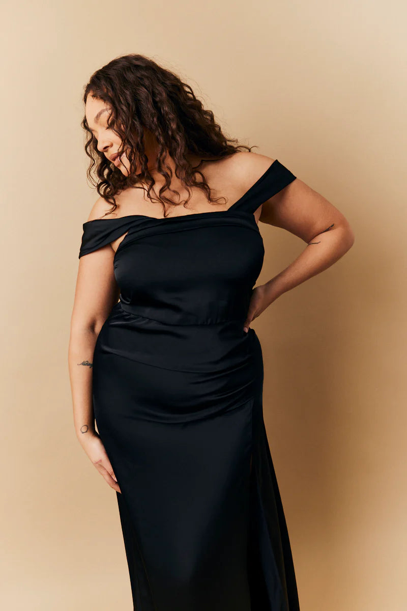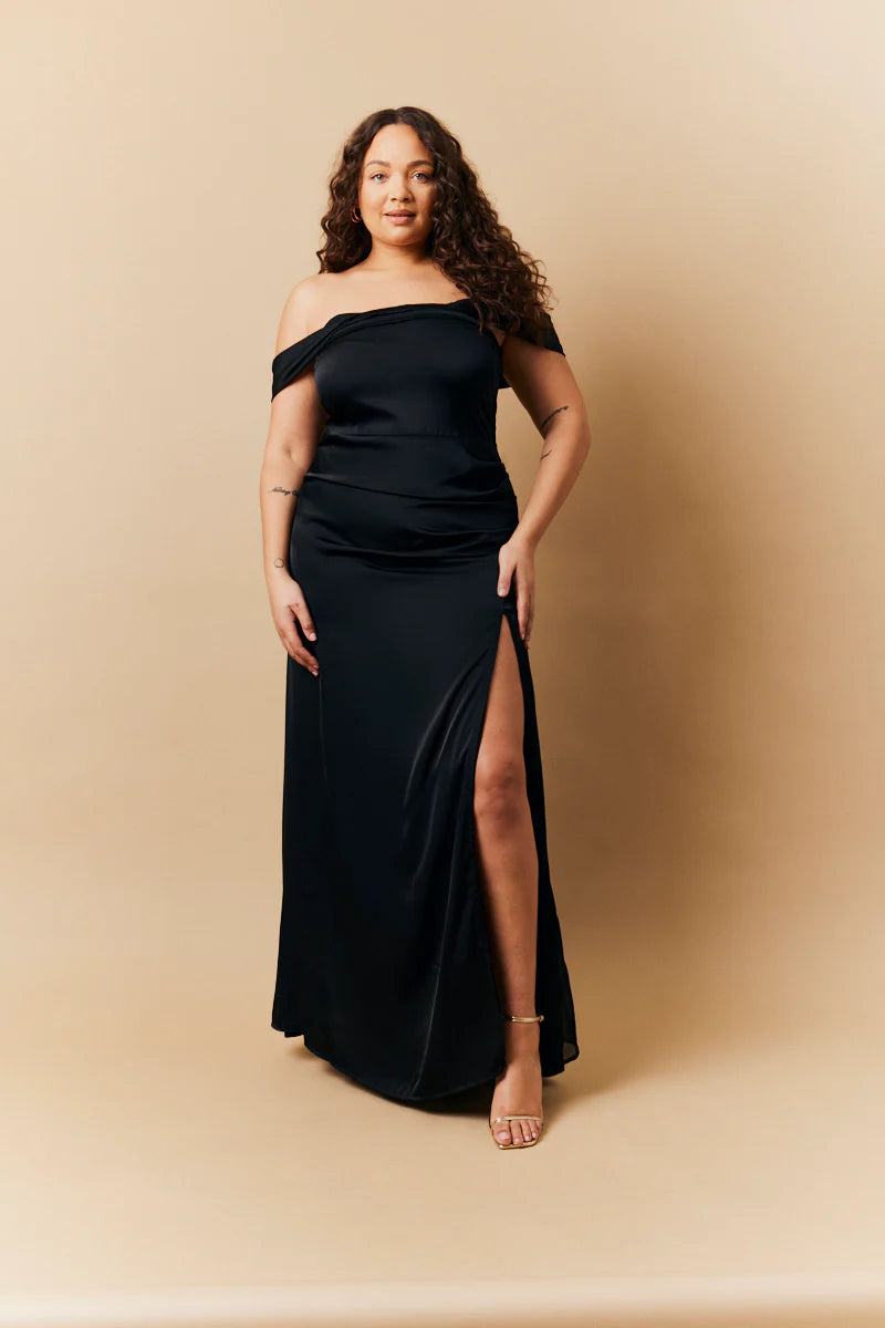 We are loving this black bardot maxi dress from our new bridesmaid collection. This dress oozes elegance and class with its ruched detailing and luxurious satin fabric that flows beautifully. Pair with heels and jewellery to complete the perfect bridesmaid look.